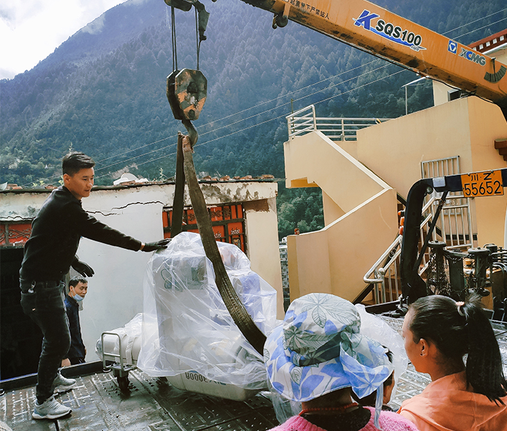 到達裝機醫院,售后工程師休息片刻便開(kāi)始拆箱,機器需要安裝在醫院的二樓,由于樓梯太窄,無(wú)法人工搬運,為了確保設備及人員安全,大家一起協(xié)作,聯(lián)系了當地的吊車(chē),把機器吊上了二樓。
